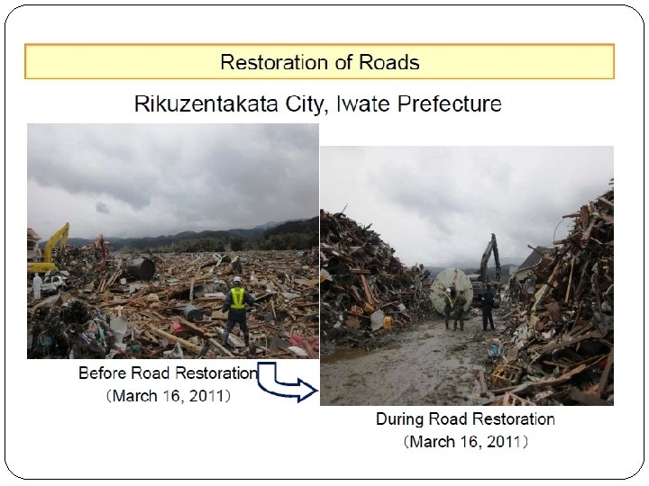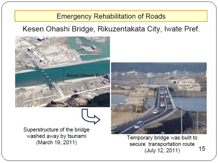 Road Damage �Almost 4, 000 road segments, 78 bridges and 29 railway locations were reported to be damaged �Accumulated debris in the downtown of Kamaishi City, Iwate Prefecture, and a damaged arterial (national highway 45) virtually isolated the community from rescue efforts �About 76 percent of the highways in the area were closed due to damage