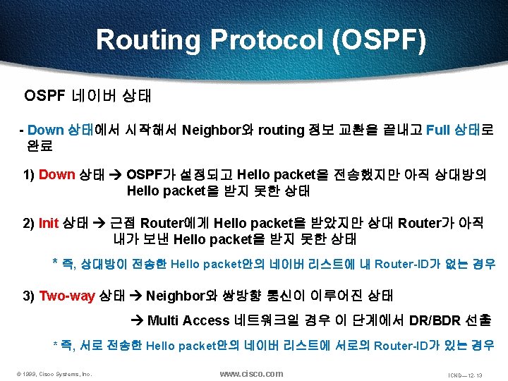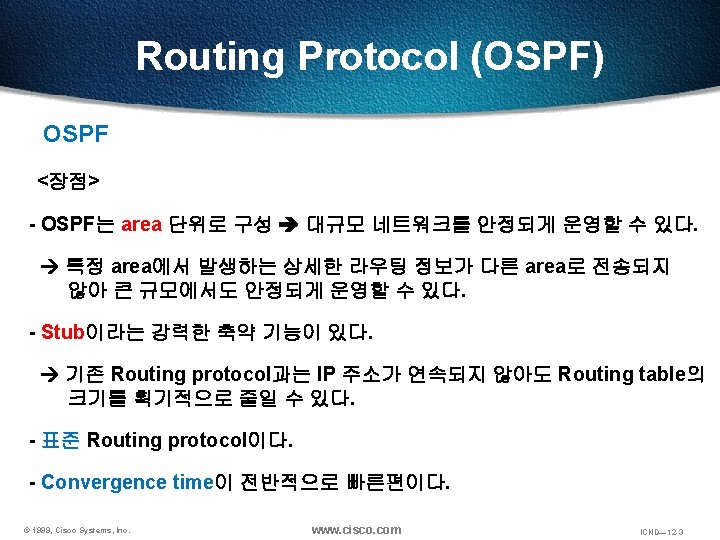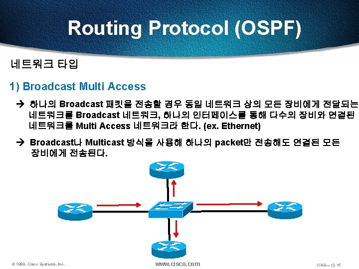 Routing Protocol (OSPF) OSPF - Link-state 라우팅 프로토콜 - Classless 라우팅 프로토콜 (VLSM, CIDR 지원) - Metric은 cost 사용 (10^8/Bandwidth(bps)) - Multicast를 사용해서 정보를 전달한다. 224. 0. 0. 5 (DR이 DROTHER에게 전송할 때 사용) 224. 0. 0. 6 (DROTHER가 DR에게 전송할 때 사용) - AD값은 110 - SPF (Shortest path First)또는 Dijkstra라 알고리즘을 이용해서 각 목적지까지의 최적 경로를 계산 © 1999, Cisco Systems, Inc. www. cisco. com ICND— 12 -1