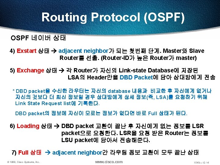 Routing Protocol (OSPF) OSPF Packet 1) Hello packet 2) DBD packet 3) LSR packet 4) LSU packet 5) LSAck packet © 1999, Cisco Systems, Inc. www. cisco. com ICND— 12 -6
