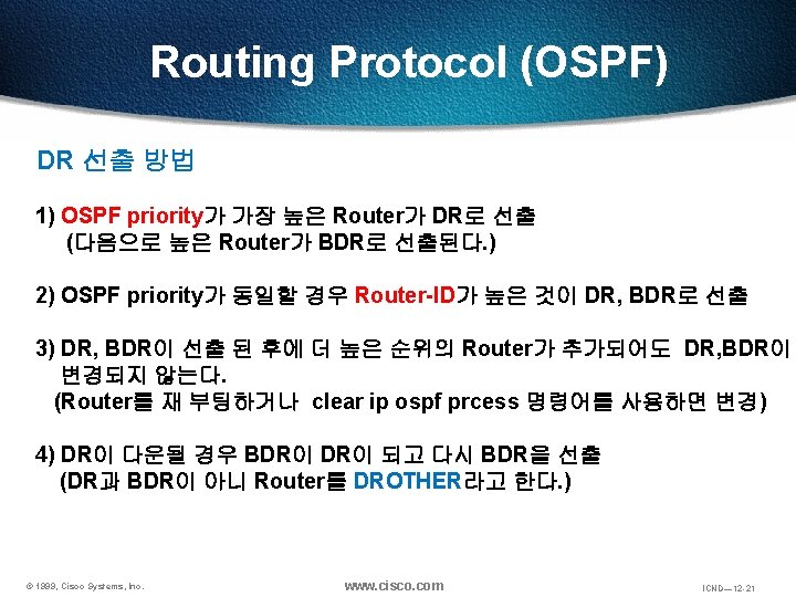 Routing Protocol (OSPF) DR/BDR - 중계 역할을 하는 DR(Designated Router)를 선출하고, DR에 문제가 발생할 경우를 대비해서 Backup용으로 BDR(Backup DR)을 선출한다. - DR, BDR은 Broadcast 및 Non Broadcast 네트워크에서만 사용. (Point-to-Point 네트워크에서는 사용하지 않는다. ) BDR 1. 1 DR LSA : ACK : © 1999, Cisco Systems, Inc. www. cisco. com ICND— 12 -20