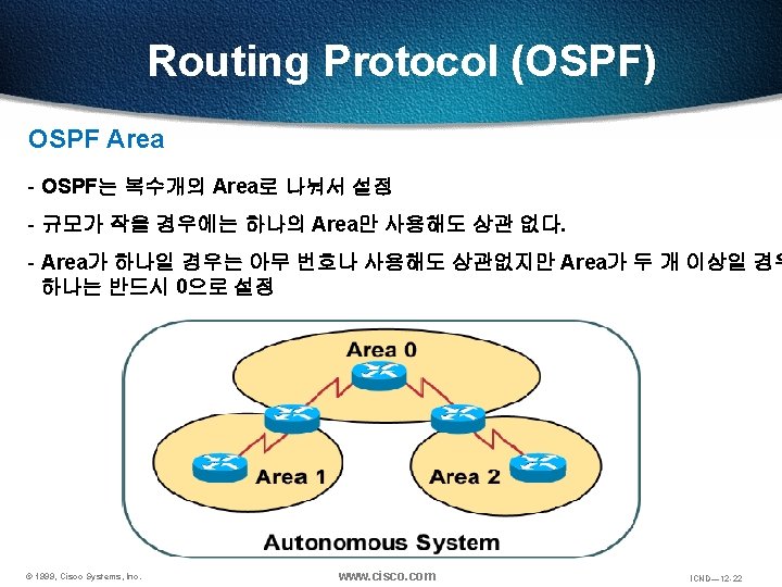 Routing Protocol (OSPF) - OSPF Area © 1999, Cisco Systems, Inc. www. cisco. com ICND— 12 -2