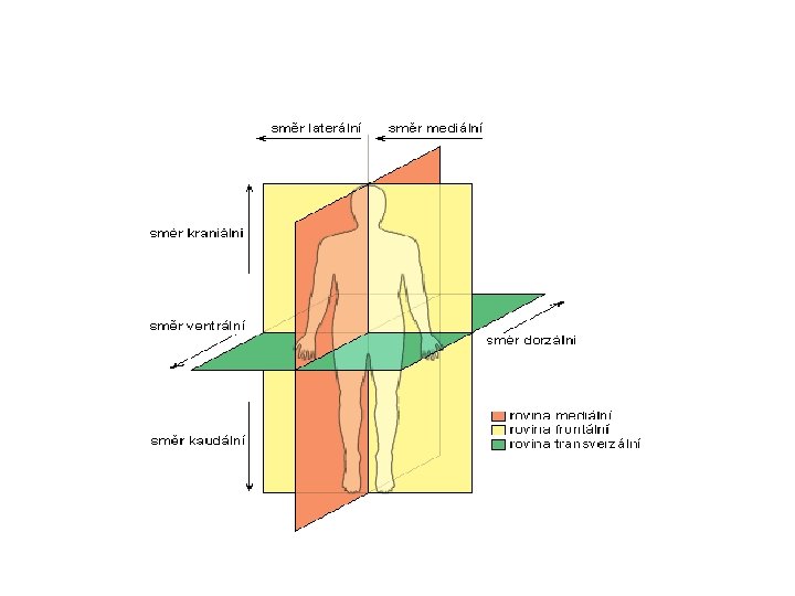 Směry na těle • • • MEDIÁLNÍ – směr ke střední rovině LATERÁLNÍ – směr od roviny střední VENTRÁLNÍ – směr dopředu, proložený břichem DORSÁLNÍ – směr dozadu EXTERNUS – zevní INTERNUS – vnitřní DEXTER – pravý SINISTER – levý SUPERFICIALIS – povrchový PROFUNDUS - hluboký