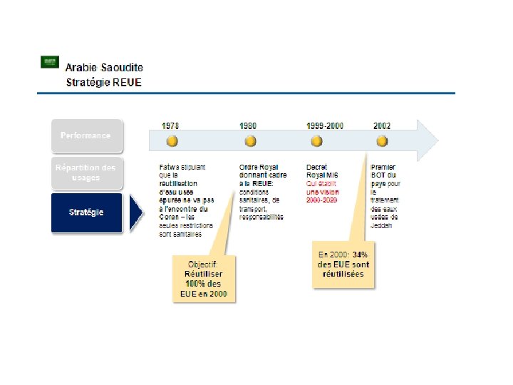 Questions clés relatives à la REUE l l l Quel est l’état des lieux de la réutilisation des eaux usées épurées (REUE) dans le monde? Quels sont les facteurs clés ayant permis le développement de la REUE dans les pays qui en font le plus? Quelles sont les questions clés relatives au cadre réglementaire et institutionnel de la REUE? l Quelles sont les implications pour le Maroc ?
