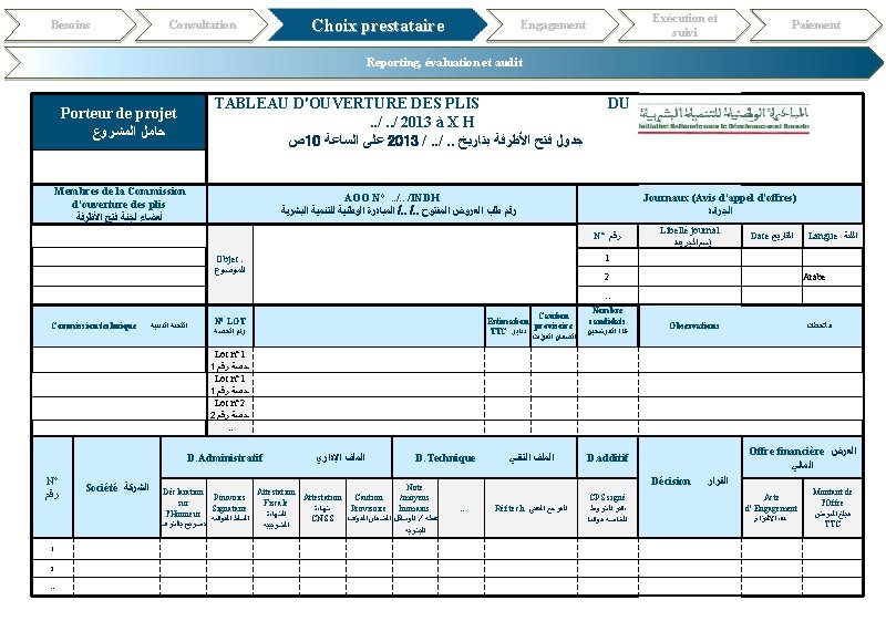 Consultation Besoins Choix prestataire Engagement Exécution et suivi Paiement Reporting, évaluation et audit LOGO et libellé Maître d’ouvrage 1 - Dossier administratif comprenant: a- La déclaration sur l’honneur qui doit comporter les mentions prévues par l’Article 26 du décret n° 2 -12 -349 précité ; b- L’original du récépissé du cautionnement provisoire ou l'attestation de la caution personnelle et solidaire en tenant lieu le cas échéant ; c- pour le groupement une copie légalisée de la convention constitutive du groupement prévue par l’Article 157 du décret n° 2 -12 -349 précité. AVIS D’APPEL D’OFFRES OUVERT N°. . /INDH Le. . /. . à. . Heures « date et heure ouverture des plis » , il sera procédé, dans les bureaux de la ………. . « Adresse exacte d’ouverture des plis » à l’ouverture des plis relatifs à l’appel d’offres sur offres de prix relatif à « Objet de l’appel d’offres » . Le dossier d’appel d’offres peut être retiré à …. « Adresse exacte de retrait des plis » . L’estimation du coût global des prestations s’élève à XX, XX DH «Montant de l’estimation financière Le Montant du cautionnement provisoire est de : XX, XX DH «Montant de la caution provisoire en valeur : à supprimer si le CPS ne le stipule pas» . Le contenu ainsi que la présentation des dossiers des concurrents doivent être conformes aux dispositions des articles 27 et 29 du décret n° 2 -12 -349 du 8 joumada I 1434 (20 mars 2013) précité. Les concurrents peuvent : - Soit déposer contre récépissé leurs plis à … « Adresse exacte de dépôt des offres » . - Soit les envoyer par courrier recommandé avec accusé de réception à l ’adresse précitée; - Soit les remettre au président de la commission d’appel d’offres au début de la séance et avant l’ouverture des plis. Les pièces justificatives à fournir sont celles prévues par l’article 25 du décret n° 2 -12 -349 précité, à savoir: 2 - Dossier technique comprenant: - Une note indiquant les moyens humains et techniques du concurrent, le lieu, la date, la nature et l’importance des prestations qu’il a exécutées ou à l’exécution desquelles il a participé ; - Les attestations délivrées par les hommes de l’art sous la direction desquels lesdites prestations ont été exécutées ou par les bénéficiaires publics ou privés desdites prestations. Chaque attestation précise notamment la nature des prestations, le montant, les délais et les dates de réalisation, l’appréciation, le nom et la qualité du signataire. 3 - Dossier additif comprenant : Toutes pièces complémentaires exigées par le règlement de consultation en raison de l’importance ou de la complexité des prestations objet du marché. Signature