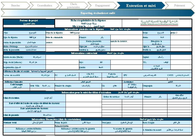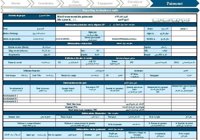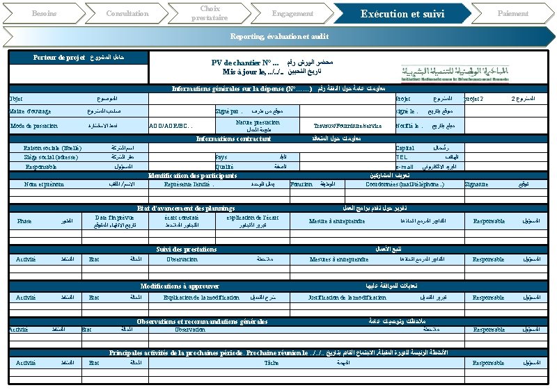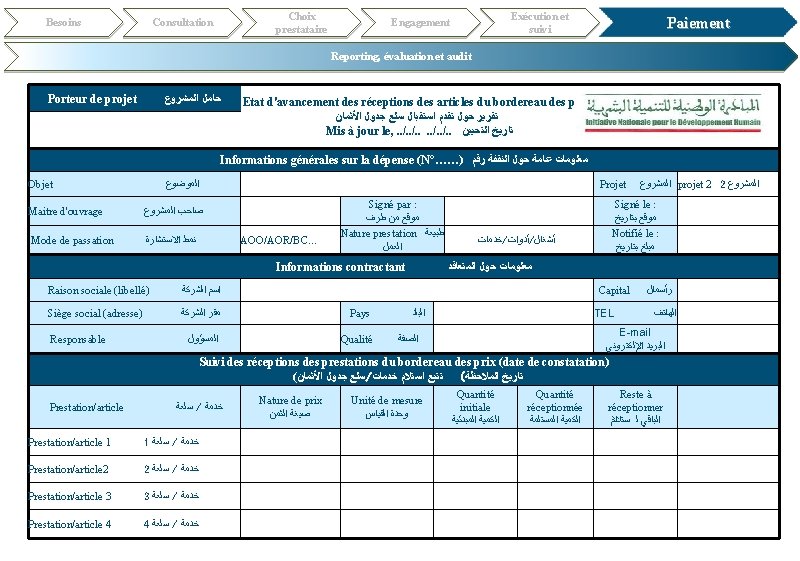 Besoins Choix prestataire Consultation Exécution et suivi Engagement Paiement Reporting, évaluation et audit Porteur de projet ﺣﺎﻣﻞ ﺍﻟﻤﺸﺮﻭﻉ Etat d'avancement physique des prestations ﺗﻘﺮﻳﺮ ﺗﻘﺪﻡ ﺍﻷﻌﻤﺎﻝ Mis à jour le, . . /. . ﺗﺎﺭﻳﺦ ﺍﻟﺘﺤﻴﻴﻦ Informations générales sur la dépense (N°……) Objet ﺍﻟﻤﻮﺿﻮﻉ ﻣﻌﻠﻮﻣﺎﺕ ﻋﺎﻣﺔ ﺣﻮﻝ ﺍﻟﻨﻔﻘﺔ ﺭﻗﻢ Projet ﺍﻟﻤﺸﺮﻭﻉ signé le : ﻣﻮﻗﻊ ﺑﺘﺎﺭﻳﺦ Notifié le : ﺍﻟﻤﺒﻠﻎ ﺑﺘﺎﺭﻳﺦ Signé par : ﻣﻮﻗﻊ ﻣﻦ ﻃﺮﻑ Nature prestation Mode de passation ﻧﻤﻂ ﺍﻻﺳﺘﺸﺎﺭﺓ AOO/AOR/BC… Travaux/Fourniture/service ﻃﺒﻴﻌﺔ ﺍﻟﻌﻤﻞ Informations contractant ﻣﻌﻠﻮﻣﺎﺕ ﺣﻮﻝ ﺍﻟﻤﺘﻌﺎﻗﺪ Raison sociale (libellé) ﺇﺳﻢ ﺍﻟﺸﺮﻛﺔ Capital ﺭﺃﺴﻤﺎﻝ Siège social (adresse) ﻣﻘﺮ ﺍﻟﺸﺮﻛﺔ Pays ﺍﻟﺒﻠﺪ TEL ﺍﻟﻬﺎﺗﻒ Responsable ﺍﻟﻤﺴﺆﻮﻝ Qualité ﺍﻟﺼﻔﺔ e-mail ﺍﻟﺒﺮﻳﺪ ﺍﻻﻟﻜﺘﺮﻭﻧﻲ Information pour le suivi des délais d'exécution ﻣﻌﻠﻮﻣﺎﺕ ﻟﺘﺘﺒﻊ آﺠﺎﻝ ﺍﻹﻧﺠﺎﺯ Maitre d'ouvrage ﺻﺎﺣﺐ ﺍﻟﻤﺸﺮﻭﻉ Délai d'exécution ﺃﺠﻞ ﺍﻹﻧﺠﺎﺯ Date d'effet de l'ordre de service de début des travaux ﺗﺎﺭﻳﺦ ﺍﻷﻤﺮ ﺑﺒﺪﺀ ﺍﻟﺨﺪﻣﺔ Date achèvement des travaux ﺗﺎﺭﻳﺦ ﺍﻧﺘﻬﺎﺀ ﺍﻷﺸﻐﺎﻝ Délai de garantie ﻣﺪﺓ ﺍﻟﻀﻤﺎﻧﺔ Ordres de services ﺃﻮﺍﻣﺮ ﺍﻟﺨﺪﻣﺔ Ordre d'arrêt ﺃﻤﺮ ﺑﺎﻟﺘﻮﻗﻒ Ordre reprise ﺃﻤﺮ ﺑﺎﻻﺳﺘﺌﻨﺎﻑ projet 2 date effet ﺗﺎﺭﻳﺦ ﺳﺮﻳﺎﻥ ﺍﻟﻤﻔﻌﻮﻝ Numéro ﺭﻗﻢ … Suivi état d'avancement ﺗﺘﺒﻊ ﺗﻘﺪﻡ ﺍﻷﻌﻤﺎﻝ Phase (Description sommaire) ﺍﻟﻄﻮﺭ Etape (Description sommaire) ﺍﻟﻤﺮﺣﻠﺔ achevée en cours non entamée Etat ﺍﻟﺤﺎﻟﺔ Observations (date d'achèvement prévue, risques, Reste à faire, observation émise au prestataires ﻣﻼﺣﻈﺎﺕ