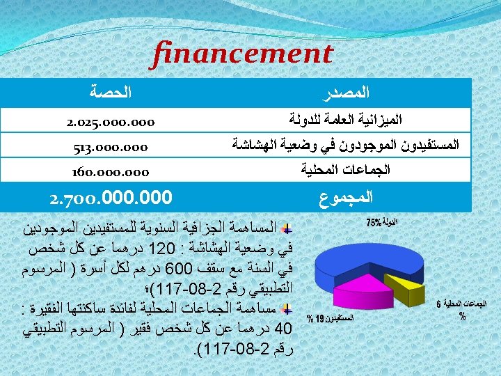 Score patrimonial : exemple �Le chef d’un foyer composé de 4 personnes déclare dans le formulaire qu’il possède un patrimoine de : � 2. 5 ha Bour (13*2, 5=32, 5 points) �Un bovin (20 points) � 4 ovins (4*5=20 points) � 15 volailles (0, 5*15=7, 5 points) �Un vélomoteur (0 point) �Un revenu de 500, 00 dh/mois (500*12=6000 dh/an) �Score patrimonial/ménage = 32, 5+20+20+7, 5+0+(6000* 1%) =140 �Score patrimonial/personne = 140/4=35 (score favorable)