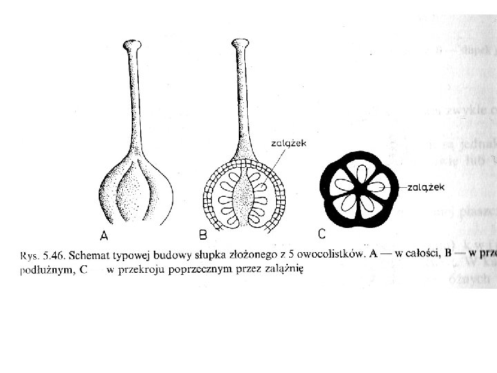 BUDOWA ZALĄŻNI ZALEŻY OD LICZBY I ZRASTANIA SIĘ OWOCOLISTKÓW (rys. 5. 47 A). JEŻELI W SŁUPKU WIELOKROTNYM OWOCOLISTKI ZRASTAJĄ SIĘ BRZEGAMI ZALĄŻNIA JEST JEDNOKOMOROWA. JEŻELI ZRASTAJĄ SIĘ SWYMI ZEWNĘTRZNYMI POWIERZCHNIA -MI, A ICH BRZEGI WCHODZĄ DO ŚRODKA, WÓWCZAS ZALĄŻNIA JEST WIELOKOMOROWA LUB WYSTĘPUJĄ W NIEJ NIEPEŁNE PRZEGRODY.