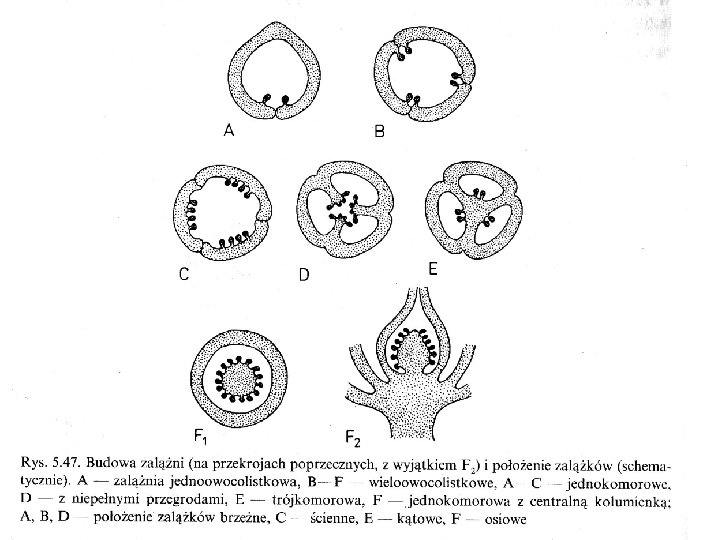 W ZALĄŻNI NA BRZEGACH LUB NA WEWNĘTRZNYCH POWIERZCHNIACH OWOCOLISTKÓW ZNAJDUJĄ SIĘ ZALĄŻKI. ICH LICZBA MOŻE BYĆ RÓŻNA – OD JEDNEGO DO WIELU. MOGĄ ONE MIEĆ POŁOŻENIE BRZEŻNE (rys. 5. 47, A, B), ŚCIENNE (rys. 47, C), KĄTOWE (rys. 47, E), OSIOWE (rys. 47 F).