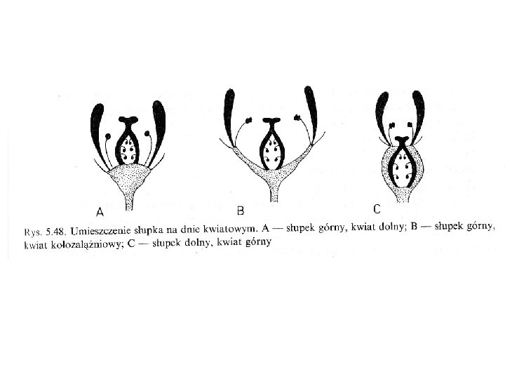 RÓŻNE MOŻE BYĆ UMIESZCZENIE SŁUPKA NA DNIE KWIATOWYM. MOŻE ON WYSTĘPOWAĆ NA SZCZYCIE WYPUKŁEGO DNA KWIATOWEGO, A POZOSTAŁE CZĘŚCI KWIATU ZNAJOWAĆ SIĘ NIŻEJ. MÓWIMY WTEDY O SŁUPKU GÓRNYM I KWIECIE DOLNYM. NIEKIEDY DNO KWIATOWE JEST WKLĘSŁE, A SŁUPEK ZNAJDUJE SIĘ NA ŚRODKU ZAGŁĘBIENIA JEDNAK NIE ZRASTA SIĘ Z NIM BOKAMI – TAKI SŁUPEK RÓWNIEŻ NAZYWA SIĘ GÓRNYM, A KWIAT KOŁOZALĄŻNIOWYM. JEŻELI OTACZAJĄCE SŁUPEK WKLĘSŁE DNO KWIATOWE ZRASTA SIĘ Z NIM – MÓWIMY O SŁUPKU DOLNYM. KWIAT NAZYWAMY ZAŚ GÓRNYM (rys. 5. 48).