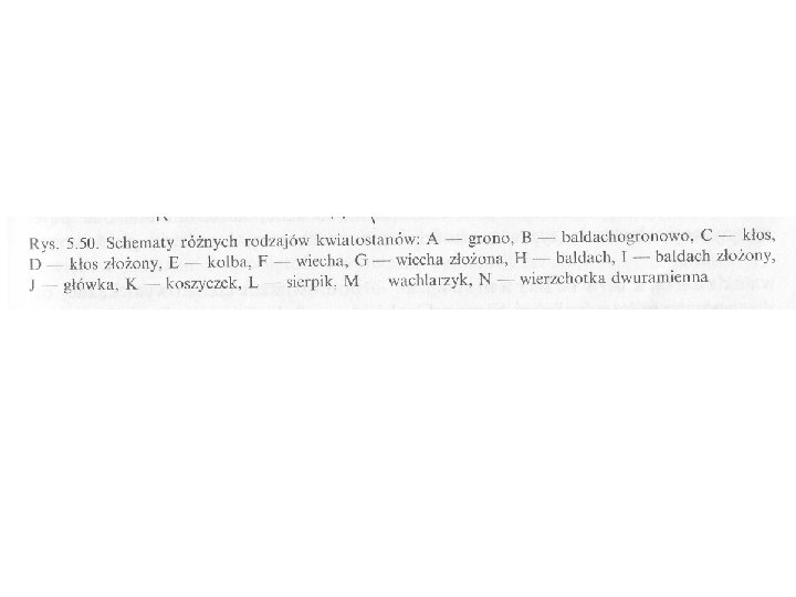● KOTKA (INACZEJ BAZIA) – JEST TO KŁOS O OSI CZĘSTO WIOTKIEJ, ZWISAJĄCEJ, OPADAJĄCY JAKO CAŁOŚĆ WRAZ Z OSIĄ (WIERZBA, LESZCZYNA); ● KOLBA – JEST TO KŁOS O OSI SILNIE ZGRUBIAŁEJ (PAŁKA, KWIATOSTANY ŻEŃSKIE KUKURYDZY); ● KŁOS ZŁOŻONY – NA OSI TEGO KWIATOSTANU OSADZONE SĄ KŁOSY PROSTE, ZWANE KŁOSKAMI (ŻYTO, PSZENICA, JĘCZMIEŃ); ● WIECHA – OŚ TEGO KWIATOSTANU TWORZY ODGAŁĘZIENIA DRUGIEGO I DALSZYCH RTZĘDÓW; NA KOŃCACH WSZYSTKICH ODGAŁĘZIEŃ ZNAJDYJ A SIĘ POJEDYŃCZE KWIATY (BEZ LILAK, WIELE TRAW. ● WIECHA ZŁOŻONA - ROZGAŁĘZIENIA OSI KWIATOSTANU ZAKOŃCZONE SĄ NIE POJEDYŃCZYMI KWIATAMI, A KŁOSKAMI (OWIES, PROSO, KWIATOSTANY MĘSKIE KUKURYDZY). ● BALDACH – OŚ GŁÓWNA TEGO KWIATOSTANU JEST BARDZO SKRÓCONA, WSKUTEK CZEGO KWIATY NA SZYPUŁKACH JEDNAKWEJ DŁUGOŚCI WYRASTAJĄ JAKBY Z JEDNEGO MIEJSCA NA SZCZYCIE ŁODYGI; KWIATY NAJMŁODSZE ZNAJDUJĄ SIĘ W ŚRODKU BALDACHA (CZOSNEK).