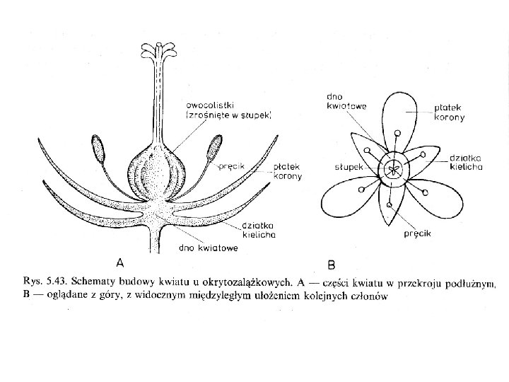 KWIAT MOŻNA UZNAĆ ZA SKRÓCONY PĘD, KTÓREGO CZĘŚCI SĄ ZWIAZANE Z ROZMNAŻANIEM PŁCIOWYM (rys. 5. 43). OŚ KWIATOWA JEST BARDZO SKRÓCONA, CZĘSTO POSZERZONA, PŁASKA, WYPUKŁA LUB WKLĘSŁA. NAZYWANA JEST DNEM KWIATOWYM. NA DNIE KWIATOWYM OSADZONE SĄ BOCZNE ELEMENTY KWIATU: DZIAŁKI KIELICHA I PŁATKI KORONY (TWORZĄCE RAZEM OKWIAT), PRĘCIKI ORAZ OWOCOLISTKI ZEASTAJĄCE SIĘ W SŁUPEK. CZĘŚCI TE OSADZONE SĄ NA DNIE KWIATOWYM SPIRALNIE LUB W POSTACI OKÓŁKÓW.