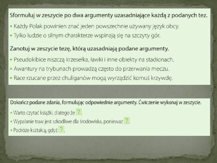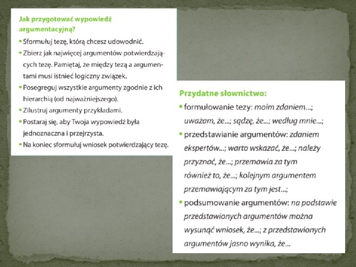 Argument – dowód potwierdzający tezę. Ma postać zdania oznajmującego. Jest już zawężeniem problemu, ale dopiero jego uzasadnienie przynosi konkretne przykłady. Argumentów powinno być co najmniej trzy i powinny być one ułożone od najważniejszego do najsłabszego (w odczuciu autora), choć można przyjąć odwrotny układ. Przykłady – do każdego argumentu dobieramy przykłady, czyli pokazujemy konkret, który potwierdza słuszność argumentu (np. do argumentu, który mówi o smogu na świecie, podam konkretne miasta będące w niechlubnej czołówce tego problemu). Zakończenie – to podsumowanie; wyciągamy wnioski. W jednym zdaniu powtarzamy krótko jeszcze raz te informacje, które pojawiły się w argumentach i potwierdzamy tezę (ew. formułujemy ją bądź obalamy – w zależności od przyjętej koncepcji). Zakończenie jednak nie może obejmować TYLKO jednego zdania