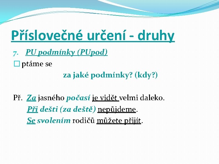 Příslovečné určení - druhy 7. PU podmínky (PUpod) � ptáme se za jaké podmínky? (kdy? ) Př. Za jasného počasí je vidět velmi daleko. Při dešti (za deště) nepůjdeme. Se svolením rodičů můžete přijít.