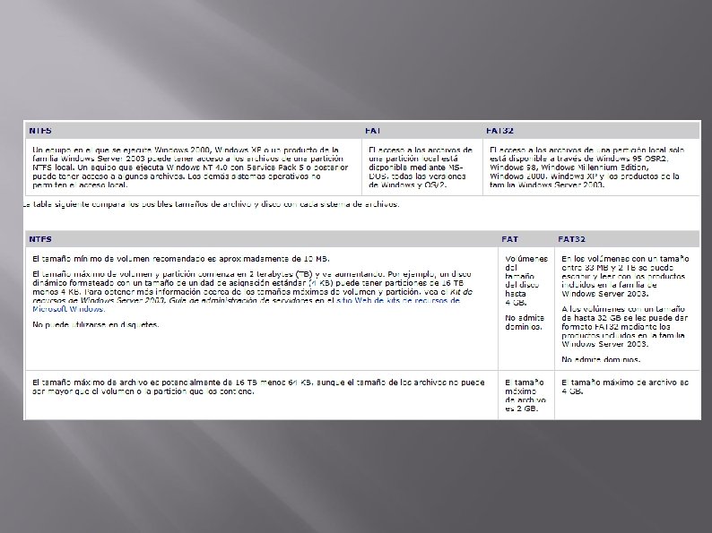 Clases de File Systems Principales características FAT y FAT 32 son similares entre sí, excepto en que FAT 32 está diseñado para discos de mayor tamaño que FAT. NTFS siempre ha sido un sistema de archivos más eficaz que FAT y FAT 32 ya que funciona mejor con discos de gran tamaño.