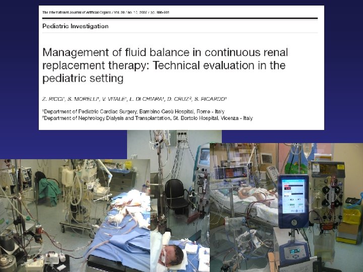 CONCLUSIONS 1. AKI in pediatric cardiac surgery is frequent. 2. UF during CPB is beneficial. 3. Application of CRRT to extracorporeal circulatory devices is possible. 4. High expertise, safe machines and trained staff is mandatory. 5. Dedicated equipment and prospective