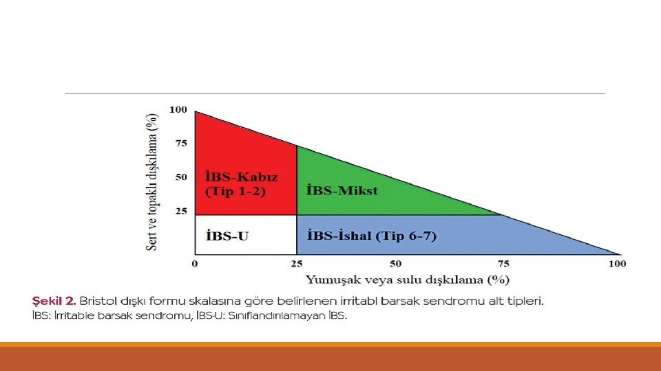 Bristol Dışkı Ölçeği kabızlığı ishalden ayırmak ve tedavi yanıtını izlemek için kullanılabilir -Tip 1 ve 2 kabızlık - Tip 3, 4, 5 karışık tip - Tip 6 -7 ishal