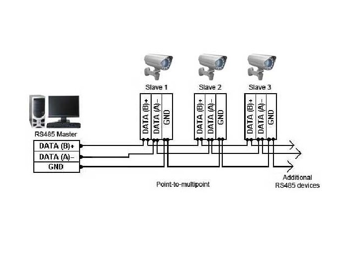 RS 485 standardı 32 adet Alıcı-Verici çiftinin aynı anda sisteme bağlanmasına izin verir. Ancak istisnai durumlar olarak çok düşük hızlarda sisteme 64 hatta 128 uç bağlanabilir. Ancak sistemin kararlı çalışması garanti edilemez. RS-485 topolojisi 2 uçlu ya da 4 uçlu şekilde olabilir. İki uçlu yapıda veriler master (efendi) ile slave (köleler-uç noktalar) arasında half dublex (aynı anda tek yönlü) olarak yapılır. Yani data akışı tek yönlü olup, veri ya efendiye doğrudur ya da uç noktalara doğrudur. Uç noktalar efendi ile konuşabilecekleri gibi birbirleri ile de konuşabilirler. Ancak hatta bir kargaşa oluşmaması için hattın veri trafiğinin biri tarafından kontrol edilmesi gerekir. Bu işi efendi yapar.