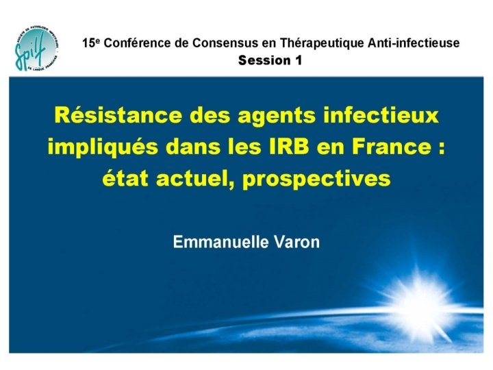 Résistance des agents infectieux impliqués dans les IRB en France : état actuel, prospective Emmanuelle VARON Hôpital Européen Georges Pompidou, Paris Microbiologie