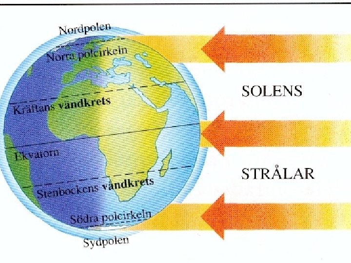 Jordens rörelser • Jorden snurrar runt sin egen axel. Denna axel är en tänkt linje som går från nordpolen rakt genom jordklotet till sydpolen. • Ett varv runt den egna axeln tar 24 timmar, ett dygn. • När jorden är vänd mot solen är det dag och när jorden är vänd från solen är det natt. • Jorden rör sig också i en bana runt solen. Ett varv runt solen tar 365 dygn och 6 timmar=ett år. • Lyser solstrålarna med en sned, liten vinkel på jorden blir temperaturen lägre. (s. 68) Kallt klimat. • När solstrålarna träffar jordytan vinkelrätt, står solen i zenit. Detta sker mellan vändkretsarna. Varmt klimat.