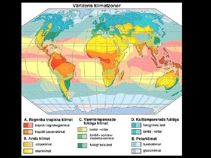 Solen står i zenit • Den heta temperaturen vid ekvatorn, i tropikerna, beror på att solen står högt på himlen hela året. • Solstrålarna träffar jordytan rakt uppifrån och varje kvadratmeter blir mycket varm. Föremål avger inga skuggor bakom sig!