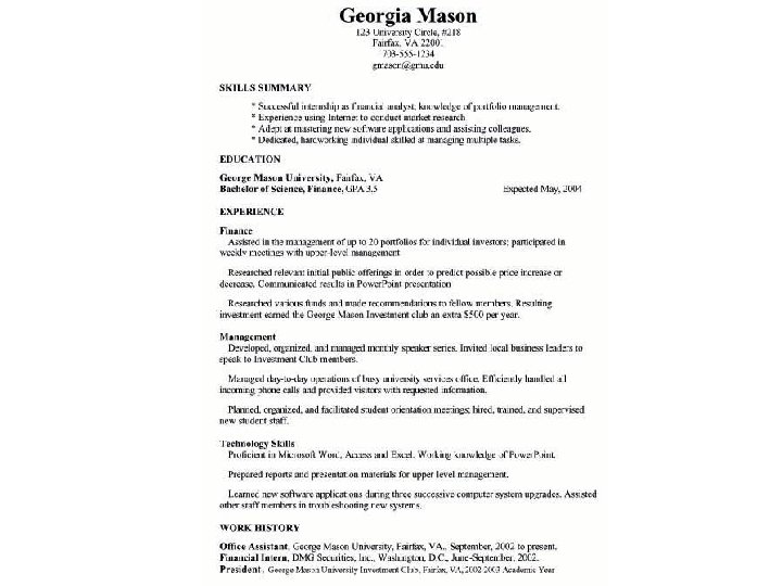 Common Mistakes Too Long Limit résumé to 1 page, especially for students Too short Too wordy Boastful Dishonest Spelling or grammar mistakes