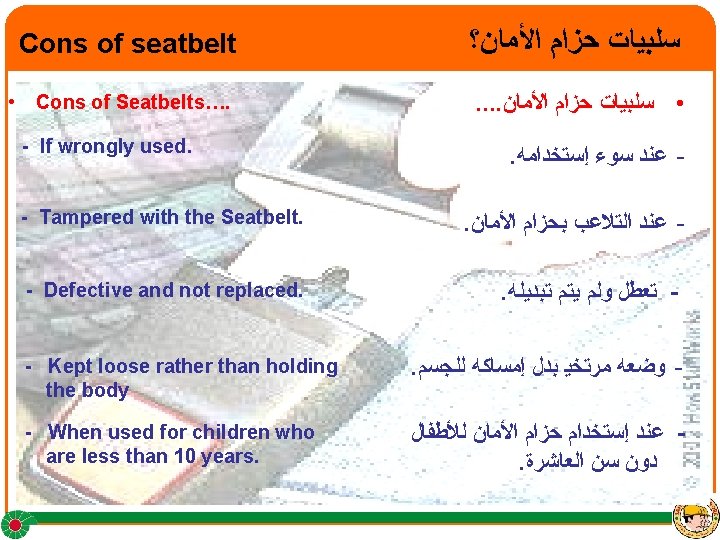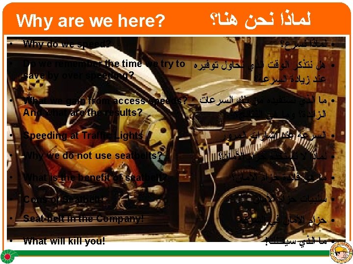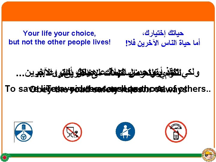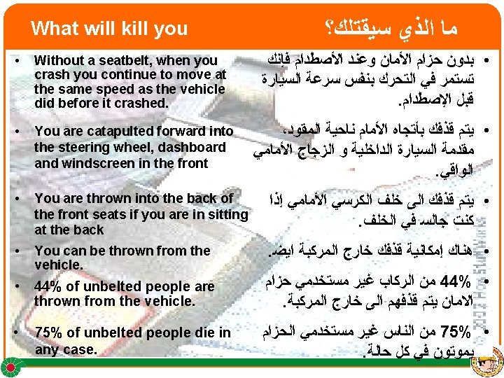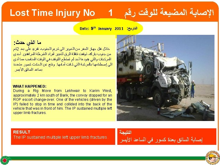 Lost Time Injury No 4 ﺭﻗﻢ ﻟﻠﻮﻗﺖ ﺍﻟﻤﻀﻴﻌﺔ ﺍﻹﺻﺎﺑﺔ Date: 25 th January 2011 : ﺍﻟﺘﺎﺭﻳﺦ : ﺣــــﺪﺙ ﺍﻟﺬﻱ ﻣﺎ ﻗﺮﺏ ﺣﻮﻗﺔ 59 ﻛﺎﻧﺖ ﻧﺎﻗﻠﺔ ﺍﻟﻤﻴﺎﻩ ﻟﺸﺮﻛﺔ ﺃﻦ ﺳﻲ ﺳﻲ ﻓﻲ ﻃﺮﻳﻘﻬﺎ ﻣﻦ ﺑﻬﺠﺔ ﺍﻟﻰ ﺭﻕ . ﺃﻨﻘﻠﺒﺖ ﺍﻟﻨﺎﻗﻠﺔ ، ﻋﻨﺪﻣﺎ ﻛﺎﻥ ﻳﺤﺎﻭﻝ ﺍﻟﺴﺎﺋﻖ ﺍﻟﻤﻨﺎﻭﺭﺓ ﻋﻨﺪ ﻣﻨﻌﻄﻒ ﺣﺎﺩ . ﻟﺘﻮﺻﻴﻞ ﺍﻟﻤﻴﺎﻩ ﺗﻢ ﺇﻧﻘﺎﺫ ﺍﻟﺴﺎﺋﻖ ﻣﻦ ﻗﺒﻞ ﺑﻌﺾ ﺍﻟﻤﺎﺭﺓ ﻭﻟﻜﻦ ﻇﻞ ﺍﻟﻤﺴﺎﻋﺪ ﻣﺤﺼﻮﺭ ﻓﻲ ﻛﺎﺑﻴﻨﺔ ﺍﻟﺴﻴﺎﻗﺔ . WHAT HAPPENED: An NCC water tanker was enroute from Bahja to Rig 59 near Hawqa to make a routine delivery. While the Driver was negotiating a sharp bend, the vehicle rolled over. The driver was rescued by a passerby but the helper remained trapped until a rescue team managed to extract him from inside the vehicle. The driver sustained multiple lacerations on his head and left elbow. The Helper sustained fractures to his left arm and his right leg. RESULTS: § Driver sustained multiple lacerations on his head and left elbow. § The Helper sustained fractures to his left arm and his right leg. : ﺍﻟﻨﺘﻴﺠﺔ . § ﺗﻌﺮﺽ ﺍﻟﺴﺎﺋﻖ ﻟﻌﺪﺓ ﺇﺻﺎﺑﺎﺕ ﻋﻠﻰ ﺭﺃﺴﻪ ﻭ ﻣﺮﻓﻘﺔ ﺍﻷﻴﺴﺮ . § ﺗﻌﺮﺽ ﺍﻟﻤﺴﺎﻋﺪ ﻟﻌﺪﺓ ﻛﺴﻮﺭ ﻓﻲ ﻳﺪﻩ ﺍﻟﻴﺴﺮﻯ ﻭﻗﺪﻣﻪ ﺍﻟﻴﻤﻨﻰ