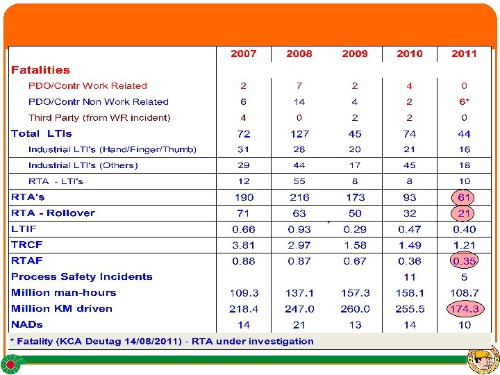 LTI No 34, 35, 36, 37 2011 LTI Notification 11 th July WHAT HAPPENED: RTA A PDO ambulance driven by Al-Khatma Driver, was taking a patient, an employee of Special Technical Services & Tebodin (STST) from Yibal to Ibri hospital, escorted by STST male nurse and STST employee. The driver lost control due to part of rear tyre getting detached from the main element. The driver and front seat passenger were wearing their seat belts. The male nurse and patient were thrown out from rear compartment of the ambulance. RESULTS: • STST employee - very serious condition in the Intensive Care Unit with head injuries. • The male nurse - multiple minor injuries, may require surgery, but is stable. • The patient - multiple fractures to his pelvis and spine, and may receive surgery for his original abdominal condition, but is stable. • • The driver - broken hand. A cast was applied and has been discharged from hospital. 42 Work Days Lost. LATERAL LEARNING • Will be available after the IRC