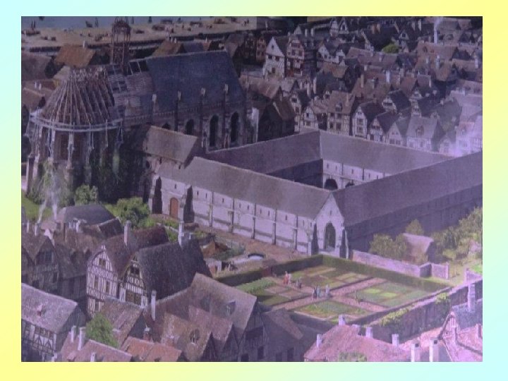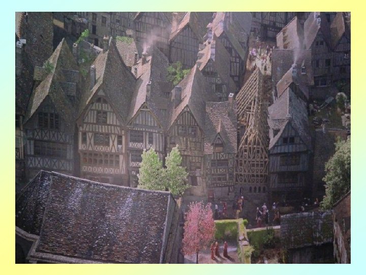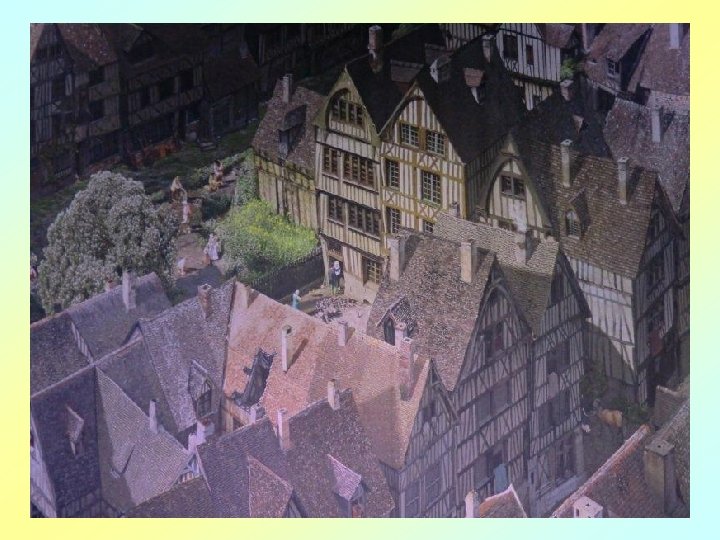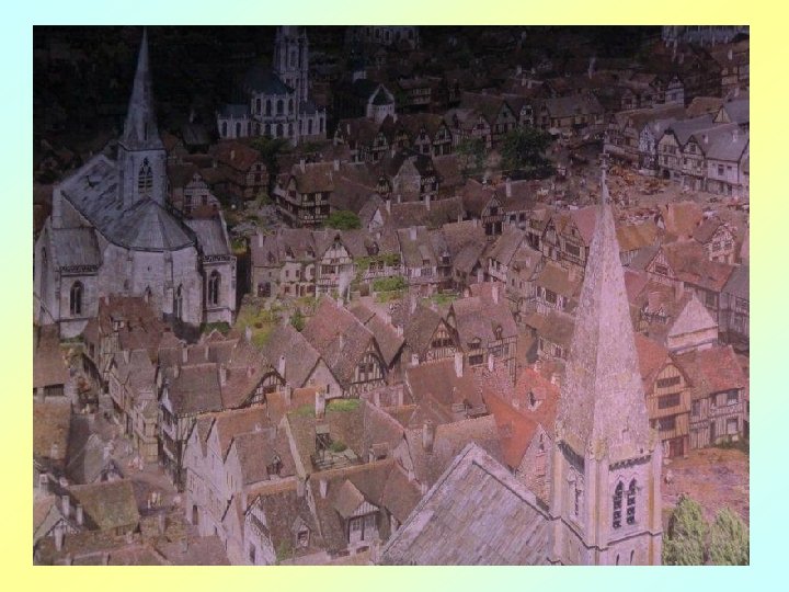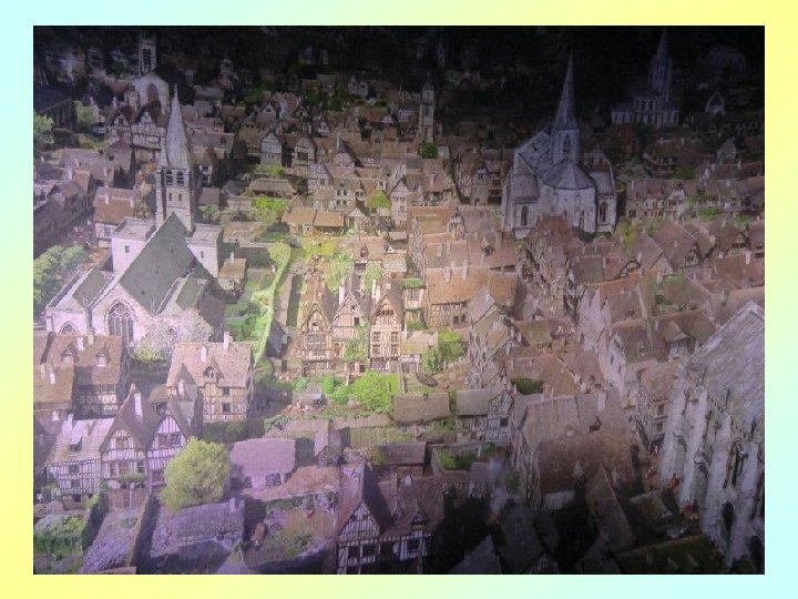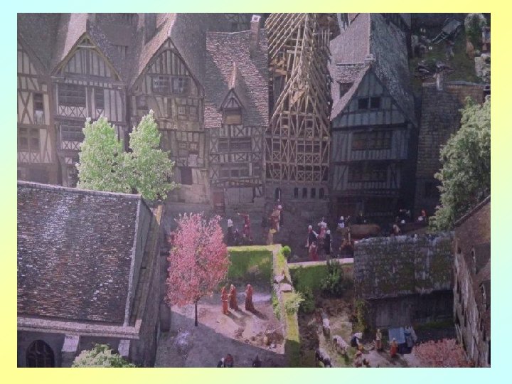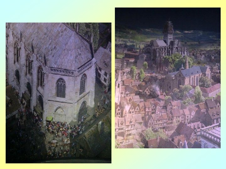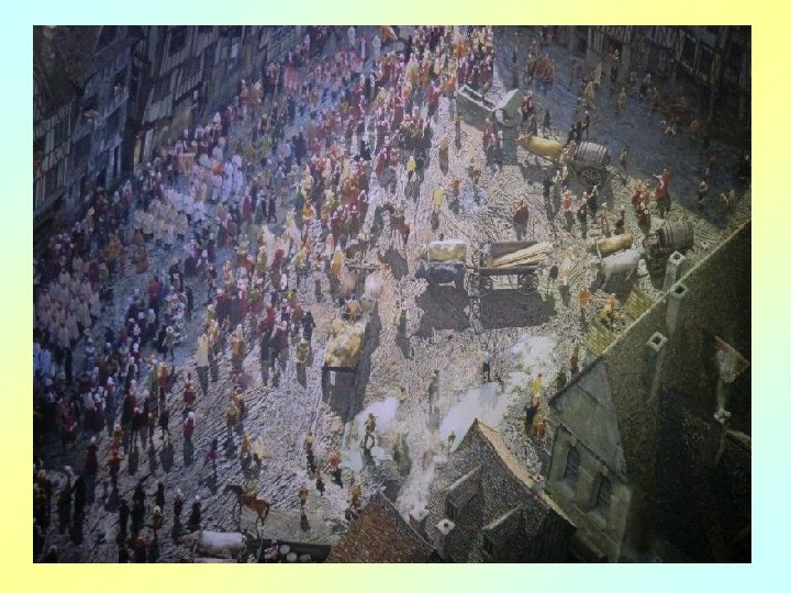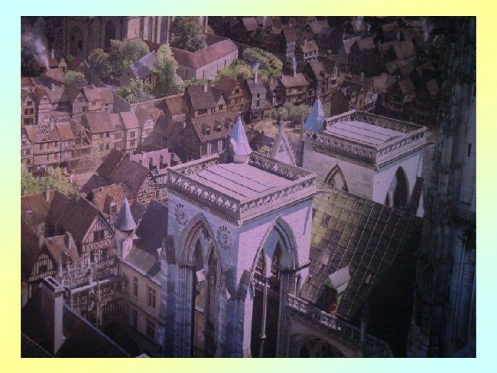 Le Rouen florissant se présente dans l’intense agitation des chevaliers, des bourgeois, des artisans et des paysans, ainsi que du clergé et de la noblesse. Avec sa « tour de Beurre » , depuis laquelle la scène se déroule, la cathédrale gothique symbolise l’architecture religieuse rayonnante de l’époque, promesse d’une lumière au cœur de l’ « obscurité » apocalyptique du Moyen ge.
