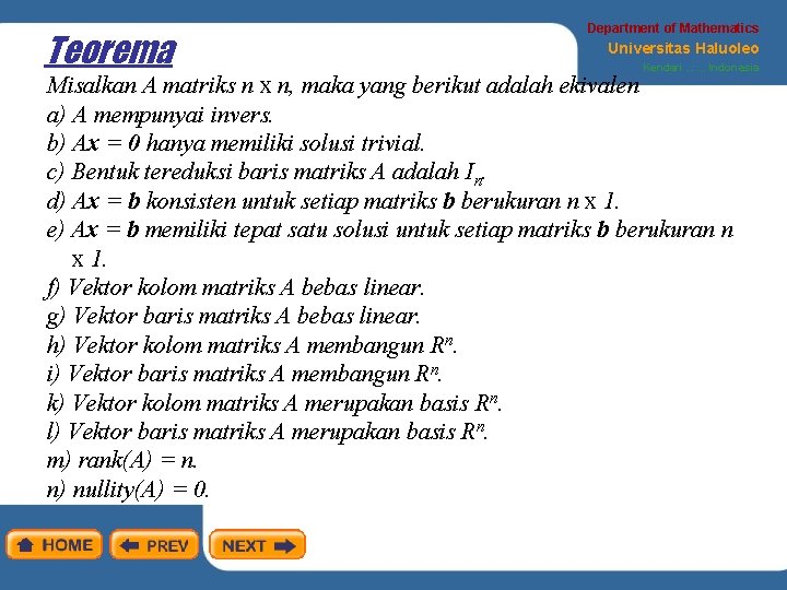 Teorema Department of Mathematics Universitas Haluoleo Kendari. . : : . . Indonesia Misalkan A matriks n x n, maka yang berikut adalah ekivalen a) A mempunyai invers. b) Ax = 0 hanya memiliki solusi trivial. c) Bentuk tereduksi baris matriks A adalah In. d) Ax = b konsisten untuk setiap matriks b berukuran n x 1. e) Ax = b memiliki tepat satu solusi untuk setiap matriks b berukuran n x 1. f) Vektor kolom matriks A bebas linear. g) Vektor baris matriks A bebas linear. h) Vektor kolom matriks A membangun Rn. i) Vektor baris matriks A membangun Rn. k) Vektor kolom matriks A merupakan basis Rn. l) Vektor baris matriks A merupakan basis Rn. m) rank(A) = n. n) nullity(A) = 0.
