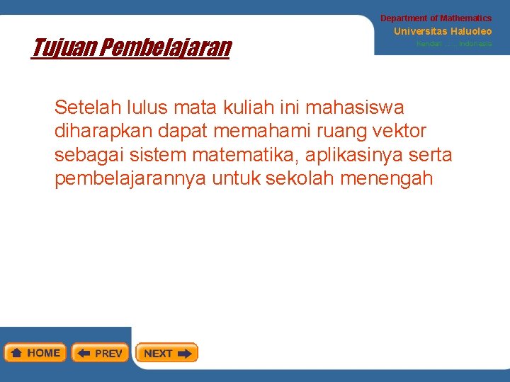 Department of Mathematics Tujuan Pembelajaran Universitas Haluoleo Kendari. . : : . . Indonesia Setelah lulus mata kuliah ini mahasiswa diharapkan dapat memahami ruang vektor sebagai sistem matematika, aplikasinya serta pembelajarannya untuk sekolah menengah