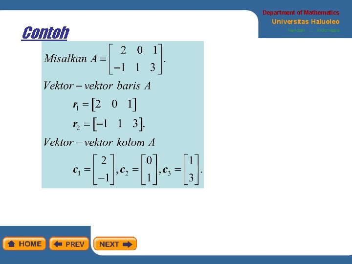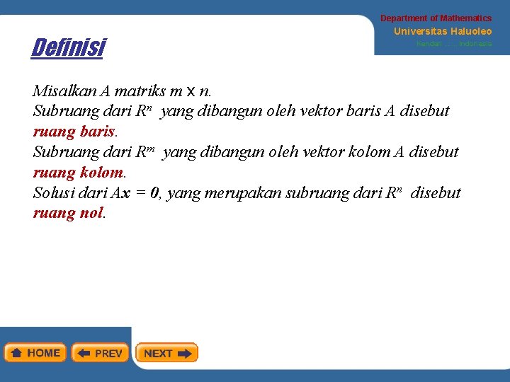 Department of Mathematics Definisi Universitas Haluoleo Kendari. . : : . . Indonesia Misalkan A matriks m x n. Subruang dari Rn yang dibangun oleh vektor baris A disebut ruang baris. Subruang dari Rm yang dibangun oleh vektor kolom A disebut ruang kolom. Solusi dari Ax = 0, yang merupakan subruang dari Rn disebut ruang nol.