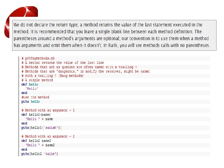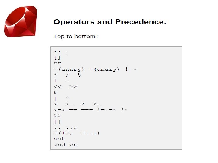 Ruby Vs Java / C++ • Ruby • C++ / Java – “Ruby”. length – strlen(“Ruby”); – s. length(); – -5. 0. abs – abs(-5. 0); – number = Math. abs(number);