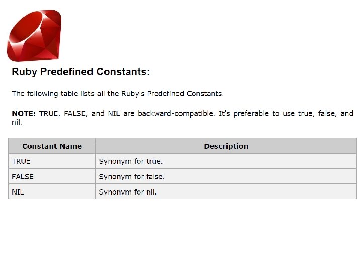 Features Free format - You can start writing your program from any line and column. Case sensitive - Lowercase letters and uppercase letters are distinct. The keyword end, for example, is completely different from the keyword END. Comments - Anything following an unquoted #, to the end of the line on which it appears, is ignored by the interpreter. Also, to facilitate large comment blocks, the ruby interpreter also ignores anything between a line starting with =begin and another line starting with =end. This only works if the = signs are the first characters of each line. Statement delimiters - Multiple statements on one line must be separated by semicolons, but they are not required at the end of a line; a linefeed is treated like a semicolon. If a line ends with a backslash (), the linefeed following it is ignored; this allows you to have a single logical line that spans several lines. Keywords- Also known as reserved words (around 41 of them) in Ruby typically cannot be used for other purposes. You may be used to thinking that a false value may be represented as a zero, a null string, a null character, or various other things. But in Ruby, all of these *values* are true; in fact, everything is true except the reserved words false and nil. Keywords would be called "reserved words" in most languages and they would never be allowed as identifiers. The Ruby parser is flexible and does not complain if you prefix these keywords with @, @@ or $ prefixes and use them as instance, class or global variable names. The best practice is to treat these keywords as reserved.