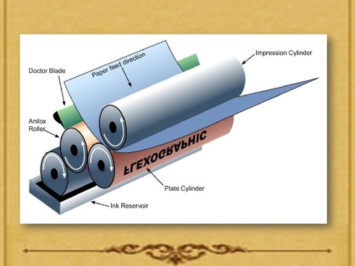 Ada 5 komponen yang umumnya ada di mesin cetak flexo : 1. Bak Tinta, Tinta fungsinya menampung tinta Untuk mesin narrow web, dengan 1 kg tinta mesin sudah bisa jalan. Bandingkan dengan mesin cetak lain yang bisa membutuhkan 15 s/d 20 kg tinta untuk setup awal. 2. Roll penjilat/fountain, penjilat/fountain fungsinya mengambil tinta dari bak tinta