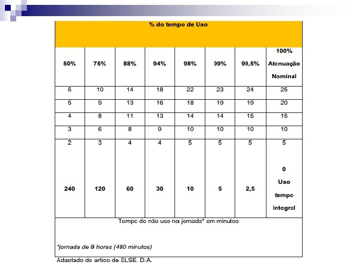 Equações matemáticas equivalentes para transformar dose diária em porcentagem e nível de exposição em d. B e vice-versa: n NE = 10 x log (480 x D ) + 85 TE 100 (d. B(A)) (NE – 85) n D = TE x 100 x 2 480 3 (%)