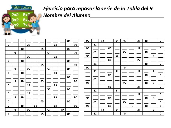 Tabli. Loca del 9 ROJO 9 x 0 = ____ 9 x 1= ____ 9 x 2= ____ AZUL 9 x 3 = ____ 9 x 4= ____ 9 x 5= ____ VERDE 9 x 6 = ____ 9 x 7= ____ 9 x 8= ____ ROSA 9 x 9= ____ 9 x 10= ____ 0 18 72 90 27 63 45 81 9 54 36