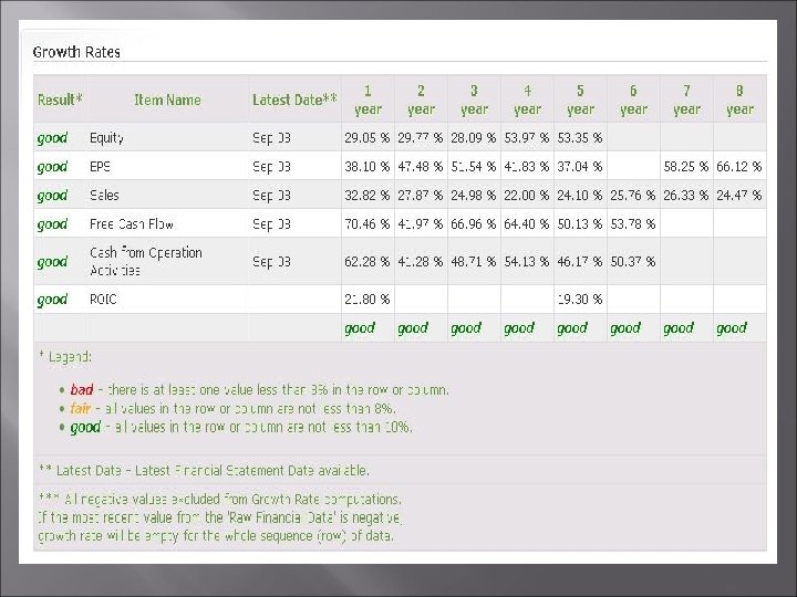 The Big Five Numbers Return on investment Sales growth rate Earnings per share Equity or Book value growth rate Free cash flow growth rate Alle 5 de numbers het liefste minimaal 10 % p/jaar, het liefst voor de laatste 10 jaar.