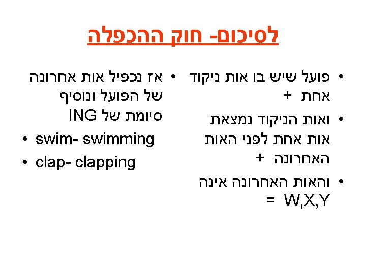 . ing יש להכפיל את האות האחרונה של הפועל ולהוסיף את הסיומת Double the last letter of the verb and add the ing running cv c swimming cvc buy- buying w, x, y לעולם אין להכפיל את האותיות mix-mixing row-rowing