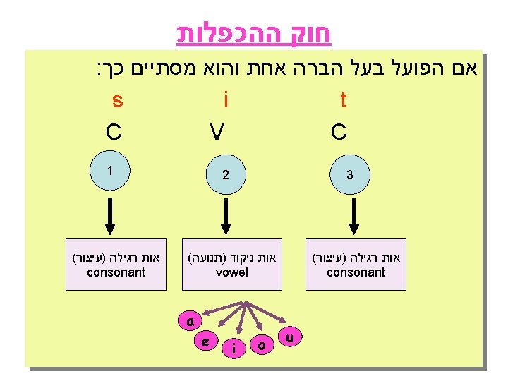 ( חוק ההכפלות )ב . אם הפועל בעל שתי הברות יש לבדוק היכן הטעם נכפיל את האות , cvc רק אם הטעם על ההברה האחרונה והיא בעלת מבנה של . ing האחרונה של הפועל לפני הוספת If the verb consists of 2 syllables, check to see were the stress is. Only if the stress is in the last syllable will we double the last letter before begin be/ gi˜n beginning cvc open o˜/pen opening