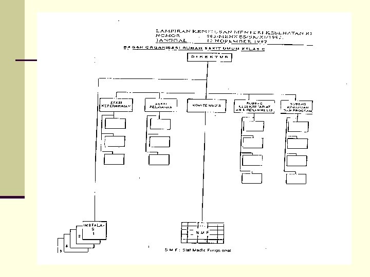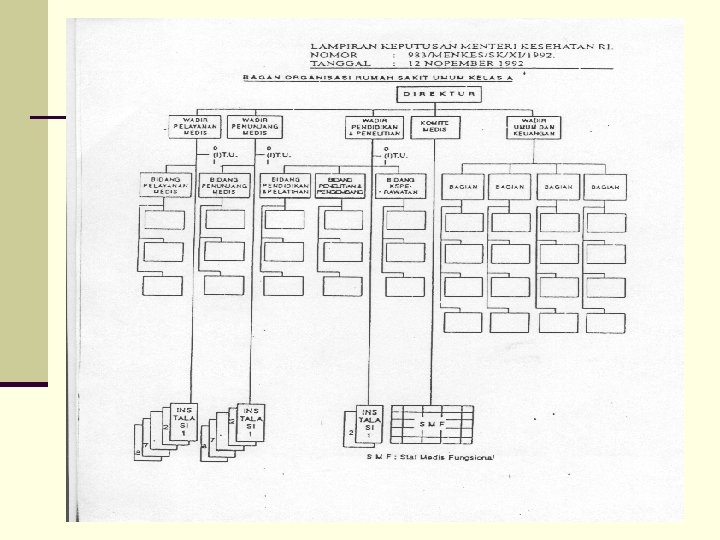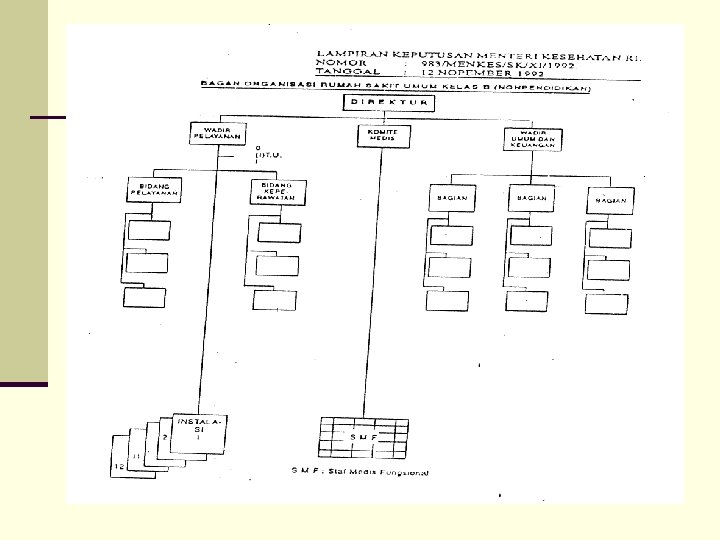 STRUKTUR ORGANISASI RS RS Umum Tipe A Staf Medis Fungsional adalah kelompok dokter yang bekerja di Instalasi dalam jabatan fungsional SMF dikelompokkan sesuai dengan keahliannya, dipimpin seorang ketua yang dipilih oleh anggota kelompoknya untuk masa bakti tertentu. SMF melaksanakan diagnosis, pengobatan, pencegahan akibat penyakit, peningkatan dan pemulihan kesehatan, penyuluhan kesehatan, pendidikan dan pelatihan serta penelitian dan pengembangan Dewan Penyantun adalah kelompok pengarah/penasehat yang keanggotaannya terdiri dari unsur Pemilik Rumah Sakit, unsur Pemerintah dan Tokoh Masyarakat. Masa kerja 3 tahun