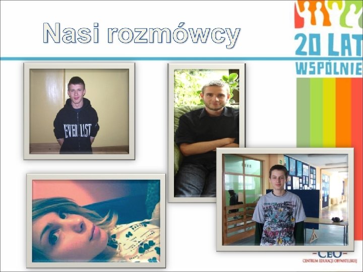 Marta Dzikowska, klasa II B, Małgorzata Kramer, klasa II B, Karolina Lewicka, klasa II B, Karolina Śledzik, klasa II B Adam Wasik, klasa I A Anna Trella, klasa II B Bartek Borkowski, klasa II B Michał Grott, klasa I Joanna Kowalska, klasa II B Patryk Rychert, klasa II B Mateusz Hepner, klasa II b Opiekun: mgr Monika Pranczke pranczke@wp. pl Wyrażamy zgodę na wykorzystanie i przetwarzanie naszych danych osobowych przez Centrum Edukacji Obywatelskiej z siedzibą w Warszawie przy ul. Noakowskiego 10, w celach promocyjnych i informacyjnych programu Młodzieżowa Akcja Obywatelska – 20 lat później zgodnie z przepisami Ustawy z dnia 29 sierpnia 1997 r. o ochronie danych osobowych (Dz. U. 2002 r. Nr 101, poz. 926 z późn. zm. ) teraz i w przyszłości. Wiemy, że przysługuje nam prawo wglądu do naszych danych oraz do ich poprawienia, a także ewentualnego usunięcia.