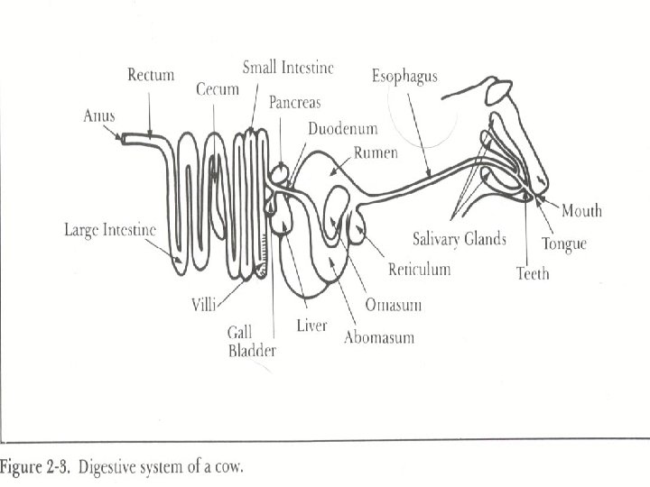 Parts of Ruminant System n n n n Mouth- teeth and lips hold food and chew it, saliva moistens food. Esophagus-food travels to stomach. Four Compartments: 1 st-Rumen 2 nd-Reticulum 3 rd-Omasum 4 th-Abomasum