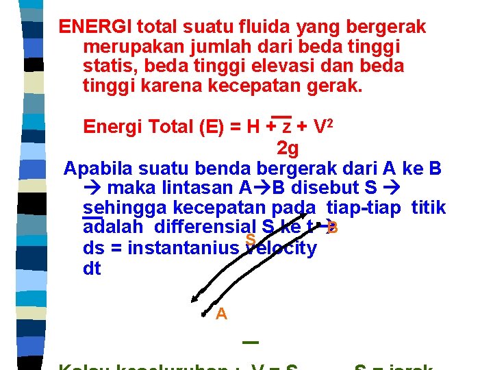 ENERGI total suatu fluida yang bergerak merupakan jumlah dari beda tinggi statis, beda tinggi elevasi dan beda tinggi karena kecepatan gerak. Energi Total (E) = H + z + V 2 2 g Apabila suatu benda bergerak dari A ke B maka lintasan A B disebut S sehingga kecepatan pada tiap-tiap titik B adalah differensial S ke t ds = instantanius S velocity dt A