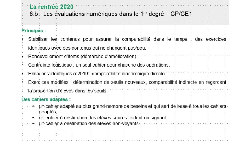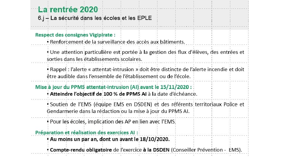 RENTRÉE 2020 (Référence : circulaire de rentrée, Plan académique de lutte contre le décrochage) • L'objectif de cette rentrée 2020 est d'accueillir tous les élèves dans un cadre serein, propice aux apprentissages et à la reprise de la vie collective. • Il s'agit aussi de déployer tous les moyens nécessaires pour permettre la remise à niveau des élèves ayant le plus souffert de la période de confinement. • En ce début d'année scolaire, les priorités sont d'évaluer les élèves afin de mieux les accompagner et de consolider leurs apprentissages. Une réponse personnalisée leur sera apportée afin qu'ils retrouvent le chemin de la réussite. • Chaque enseignant s’appuiera sur ces priorités nationales et utilisera autant que de besoins les ressources et exercices proposés.