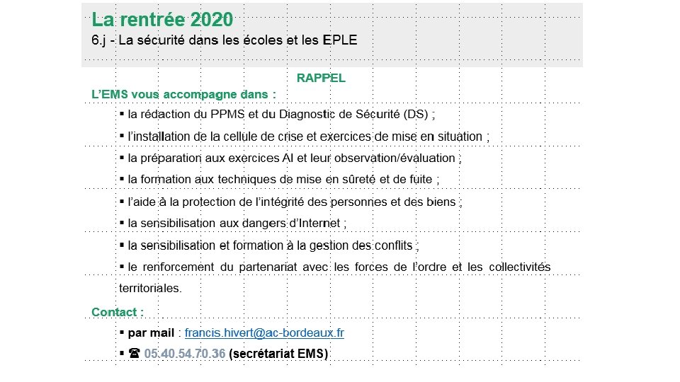 SÉCURITÉ, HYGIÈNE • LES FICHES COVID : lues avec attention par chaque enseignants, ATSEM, AESH, … Message DSDEN : lire avec attention (plusieurs situations nous ont déjà été remontées par des personnels n'en ayant pas pris connaissance, ce qui complexifie le traitement des situations et engorge les services). Bien se référer à la note de bas de page de la fiche 2 pour identifier les cas de "contact à risque". Précisions sur la fiche 2 > III - Traitement des cas contacts "le directeur ou le chef d'établissement transmet cette liste immédiatement à l'IA-DASEN (dsden 64 -covid 19@ac-bordeaux. fr) et à son médecin de secteur (cf. liste en pièce jointe, mise à jour à cette rentrée ). Dans l'urgence, le tableau excel a été mis sous la forme "médecin par onglet". Dans les prochains jours, un tableau synthétique avec une nouvelle mise en page vous sera transmis. En cas d'impossibilité d'établir un contact rapide avec le médecin de secteur, contacter la DSDEN. Enfin, il convient de rappeler qu'une personne cas contact direct (personnel ou élève) en cours de test et en cas de symptômes, ne doit pas se rendre dans l'établissement/l'école. Besoin en masque type 2 pour personnes vulnérables à remonter à M. Leplus