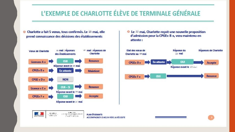 • Acceptation ou refus des propositions • Acceptation d’une seule réponse positive, abandon des autres • Conservation possible des vœux en attente • Les délais : 5 jours du 15 mai au 19 mai (J+4) • Les délais : 3 jours à partir du 20 mai et jusqu’au 19 juillet (J+2) PARCOURSUP: Répondre aux proposition s