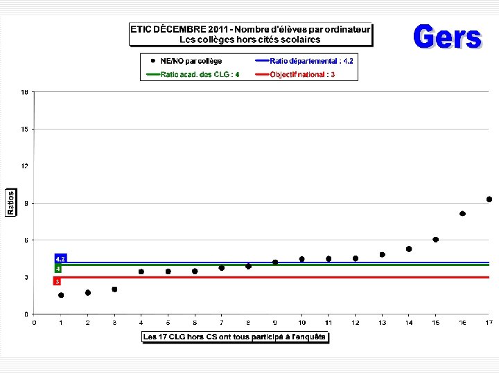 Département du GERS 21 CLG – 7 Lycées – 3 LP Objectifs Tendre vers un ratio de 1 micro pour 4 élèves en inventoriant le parc informatique présent dans les collèges. Politique globale CG 32 - Informatisation des collèges en 2012 pour un montant de 112 k€ - Mise en œuvre d’un plan d’équipement de poste dédié ENT dans les bibliothèques municipales pour les familles n’ayant pas d’accès internet ENT Engagement fort du Conseil Général du Gers dans la mise en œuvre de l’ENT 2012 -2015. Conseil général du Gers