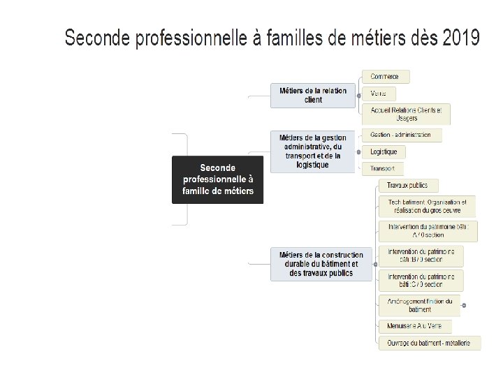 LA TRANSFORMATION DE LA VOIE PROFESSIONNELLE Des parcours plus personnalisés ■Des parcours plus progressifs grâce à des classes de seconde par familles de métiers : les élèves choisissent un secteur d’activité en fin de 3ème, puis choisissent leur spécialité de baccalauréat à la fin de la 2 de, avec une meilleure connaissance des métiers ; ■Plus d’accompagnement : 100 heures par an pour consolider les apprentissages, se renforcer en français et mathématiques, et construire son projet d’avenir ; ■Des passerelles entre l’apprentissage et le statut scolaire pour construire un cursus au plus près des besoins de l’élève. 12