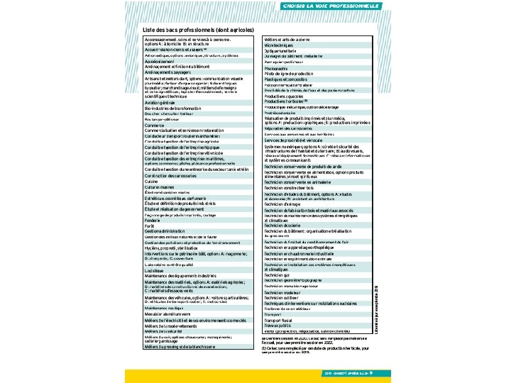 LA VOIE PROFESSIONNELLE POUR SE FORMER AUX MÉTIERS DE DEMAIN ■La voie professionnelle permet aux élèves de suivre des enseignements concrets pour apprendre un métier rapidement. ■Deux diplômes professionnels peuvent être préparés : ■ Le CAP, en 2 ans, pour une insertion immédiate dans l’emploi ou une poursuite d’études; ■ Le baccalauréat professionnel, en 3 ans, pour s’insérer dans l’emploi ou poursuivre des études supérieures. ■La formation peut être suivie : ■ Sous statut scolaire dans un lycée, avec des périodes de stage en entreprise chaque année ; ■ En apprentissage dans un lycée ou dans un CFA, avec un contrat de travail auprès d’un employeur. 8