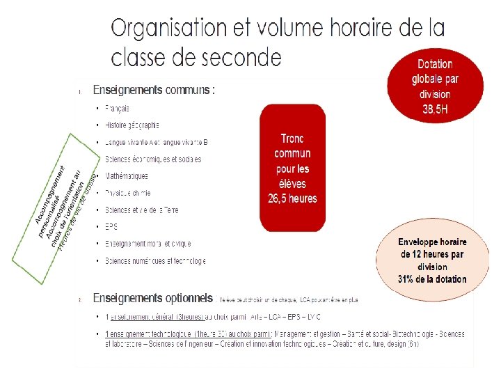 LES ENSEIGNEMENTS EN SECONDE ■ Enseignements communs – – – – – Français : 4 h Histoire - Géographie : 3 h Langues vivantes A et B : 5 h 30 Mathématiques : 4 h Physique-chimie : 3 h Sciences de la vie et de la Terre (SVT) : 1 h 30 Education physique et sportive : 2 h Enseignement moral et civique : 0 h 30 Sciences Economiques et Sociales : 1 h 30 Sciences Numériques et Technologie 1 h 30 ■ Accompagnement personnalisé individualisé en fonction des besoins ■ Enseignements optionnels – – – Latin : 2 h ou Langue vivante C : 3 h (italien ou espagnol ou luxembourgeois) ou Théâtre 2 H ou Création et Innovation Technologiques, CIT : 1 h 30 ou Sciences de l’Ingénieur, SI : 1 h 30 38
